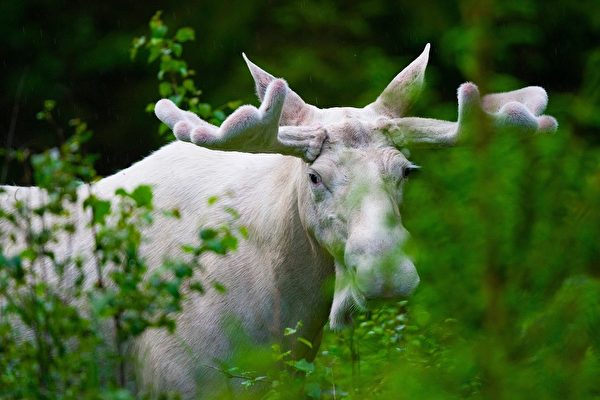 正常的驼鹿毛色是棕黄色,偶尔也会出现这种白色的,这种现象是由隐性基因导致,这种隐性基因会使动物缺乏黑色素,因而长出白色毛发,同时又带有棕色,在极少数情况下,则会完全呈现白色,而此病状并非患上白化症。
