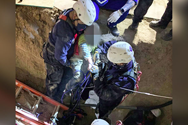 到了晚上10点半左右,井口处被拓宽,孩子身上系着保护带被消防人员抱出井口,所有在场的救援人员总算松了一口气。
