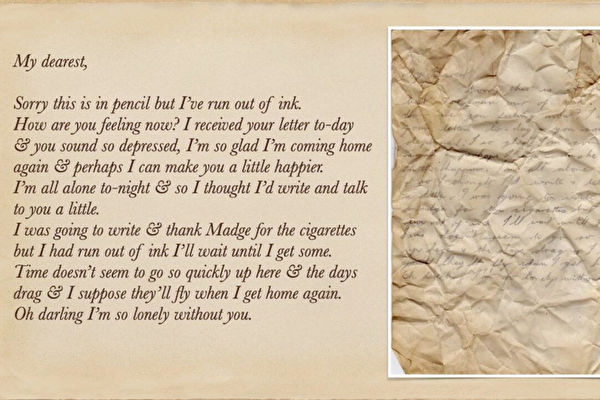 而在一封男子的回信中,他写道:“在这里,时间似乎过得不快,但一旦想着你在家里等我,细细算着回家的日子,时光将如梭飞逝。亲爱的,没有你在身边,我是如此的寂寞。”