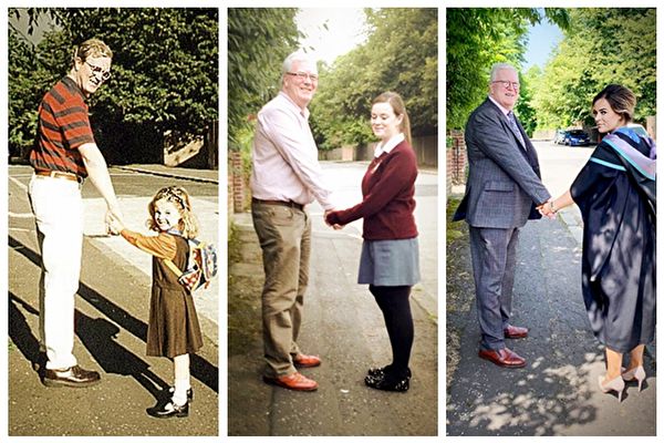 父女间微妙深刻的爱,描绘出许多感动人心的画面。英国一位爸爸日前在社交媒体分享了三张照片,分别是他与自己唯一的女儿在同一地点、同一姿势、不同年代的牵手温馨合照。这组照片在网络上广传并赢得近百万网友点赞和大量留言。