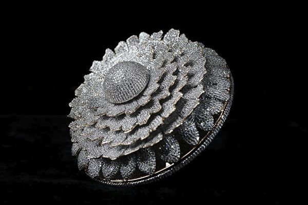 在印度文化中,人们相信万寿菊可带来繁荣和幸运,因此在班萨尔的设计中,“繁荣之戒”上面有一朵华丽的万寿菊,而戒指整体看起来也像一朵正在绽放的菊花,每一层花瓣中都镶嵌着全世界最优质的天然钻石,合计12,638颗,单是钻石重量就高达38.08克拉,而戒指总重量为165克。