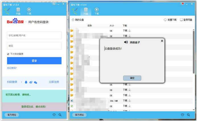 这里有一点要注意的是,登录完成之后,需要点击界面下端的提示,才能顺利获取度盘内容。