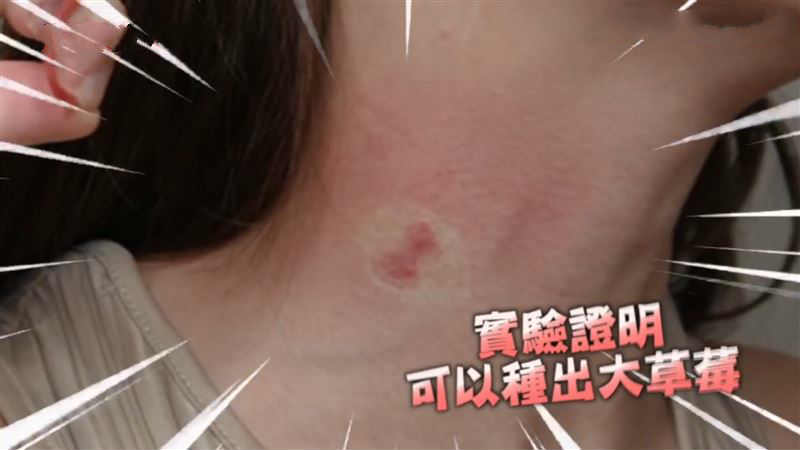▲经过一段时间后,她成功在脖子上留下两个印记。(图/技安CHI AN 授权)